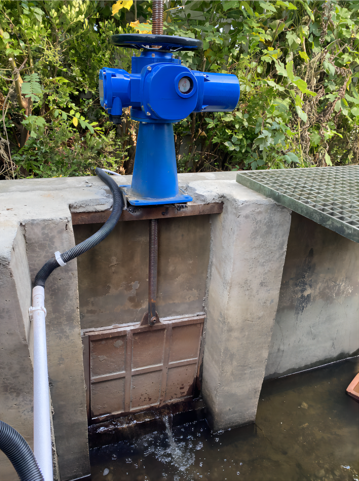此處為手動圓盤式閘閥,改造需要把閘桿更換加裝電機,改造閘門可以遠程聯(lián)動控制啟閉。三個閘閥共用一個控制柜,節(jié)省成本,方便管理,安裝在泵房內,不易破壞。泵房內,兩臺25kw的水泵控制直接啟動,為實現(xiàn)自動化及保護水泵,采用軟啟動控制柜,更穩(wěn)定,不容易出故障。